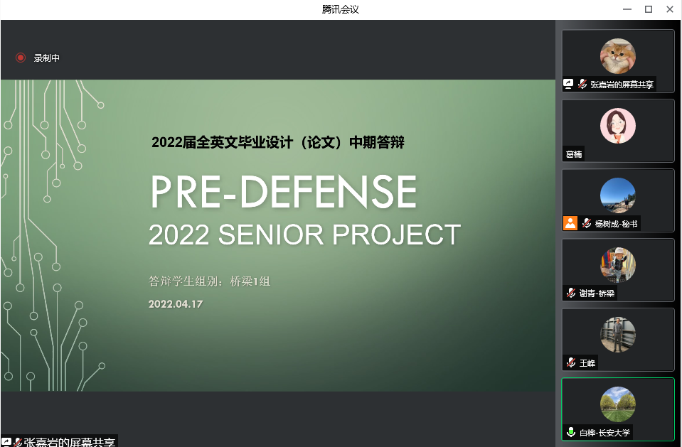 2022年4月17日,2022届道路桥梁与渡河工程(国际工程班)、道路桥梁与渡河工程(中外合作办学)专业全英文毕业设计(论文)中期答辩如期进行。道路、桥梁、岩隧、管理四个方向17个小组,245名学生和50名指导教师在腾讯会议平台参加了线上答辩。