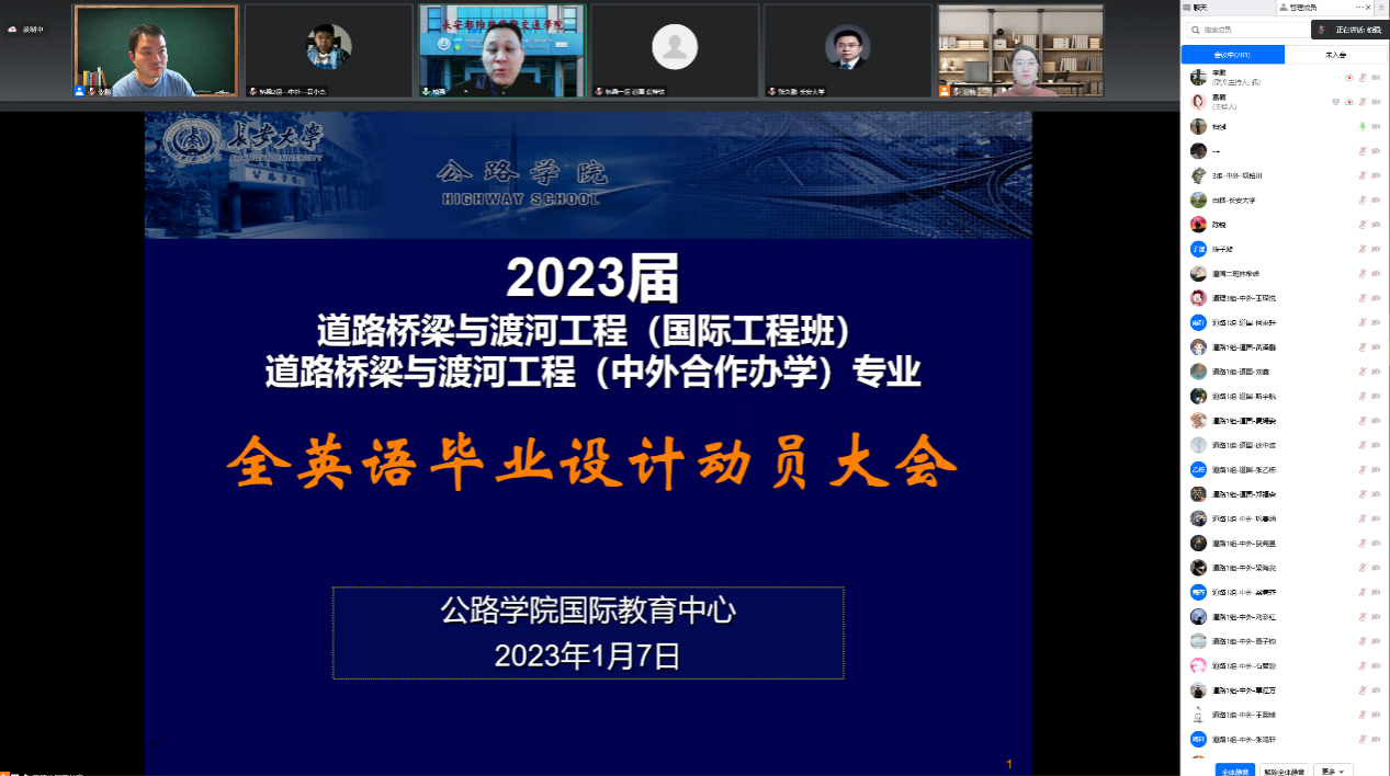 2023年1月7日上午9:00,beat365官网国际教育中心面向道路桥梁与渡河工程(国际工程班)及道路桥梁与渡河工程(中外合作办学)专业召开了2023届全英文毕业设计(论文)动员会。双语教学团队50余名指导教师及200余名学生参会。会议由国际教育中心副主任李鹏主持。