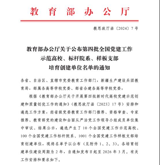 4月16日,教育部思想政治工作司发布《教育部办公厅关于公布第四批全国党建工作示范高校、标杆院系、样板支部培育创建单位名单的通知》(教思政厅函〔2024〕7号),经省级党委教育工作部门推荐、资格审查、专家推荐、教育部党的建设和全面从严治党工作领导小组成员单位集中审议、结果公示,遴选产生了10个全国党建工作示范高校、100个全国党建工作标杆院系、1001个全国党建工作样板支部培育创建单位。beat365在线唯一官网党委入选“全国党建工作标杆院系”培育创建单位。