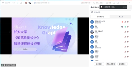 在教学研讨环节,张驰教授立足教育教学改革发展新形势,重点阐述了当前智慧课程建设的重要意义。他以《道路勘测设计》智慧课程为例,详细介绍了智慧课程“结构化、可视化、可演化”的典型特征,分享了该课程的建设历程、框架体系和应用创新,该课程通过人工智能技术,整合多源教学资源,构建“能力-问题-知识-资源”课程图谱,创新性实现“AI助教+学+管+研”的全新教学模式。张驰教授号召全系教师积极推进智慧课程建设,为学校“双一流”专业建设贡献力量。