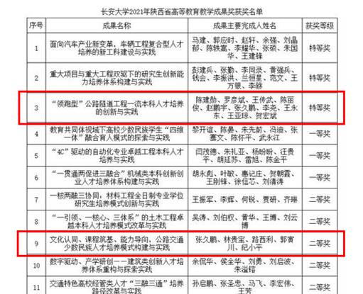 5月26日,陕西省人民政府办公厅发布了《关于表彰陕西省2021年高等教育教学成果奖获奖项目的通报》(陕政办函〔2022〕64号),我中心陈建勋教授主持的《“领跑型”公路隧道工程一流本科人才培养的创新与实践》荣获了2021年陕西省高等教育教学成果奖特等奖,张久鹏教授主持的《文化认同、课程筑基、能力导向,公路交通少数民族人才培养模式构建与实践》荣获了2021年陕西省高等教育教学成果奖二等奖。